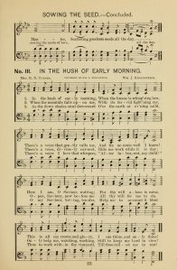 In the hush of early morning, /When the breeze is whisp’ring low,