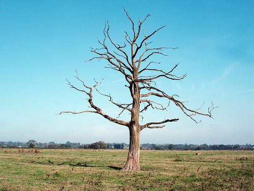 In fact, the tree died—at least I thought it died. These neighbors,however, called a tree doctor who did massive surgery on this tree to save its life. When he was finished the tree was only the trunk and a half-dozen large branches, chopped off at the end, mimicking half-amputated limbs. No branches, no leaves—just a bald, amputated tree.